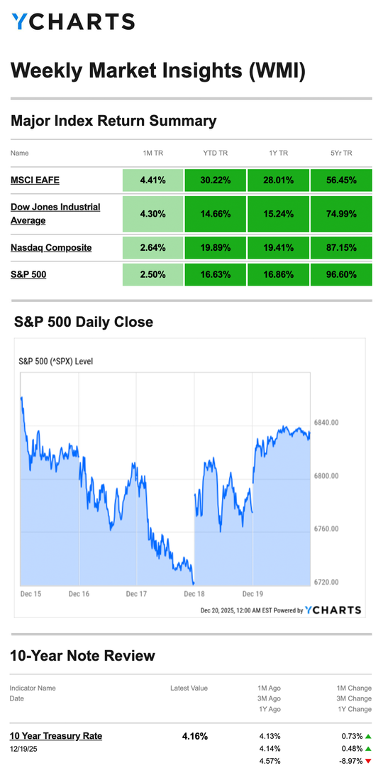 Source: YCharts.com, December 20, 2025. Weekly performance is measured from Monday, December 15, to Friday, December 19. TR = total return for the index, which includes any dividends as well as any other cash distributions during the period. Treasury note yield is expressed in basis points.